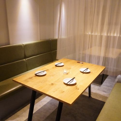 無垢の大きなテーブル、お隣とも感覚が広くゆったりとお過ごしいただけます。奥のスペースはカーテンで仕切られており、半個室空間になっております◎